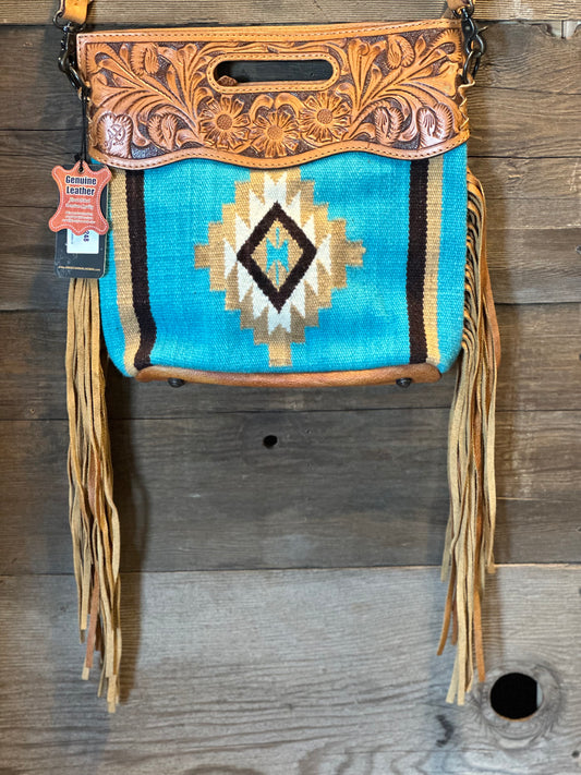 Tooled Leather Saddle Blanket Aztec Crossbody Purse ~ Turquoise and Tan 248